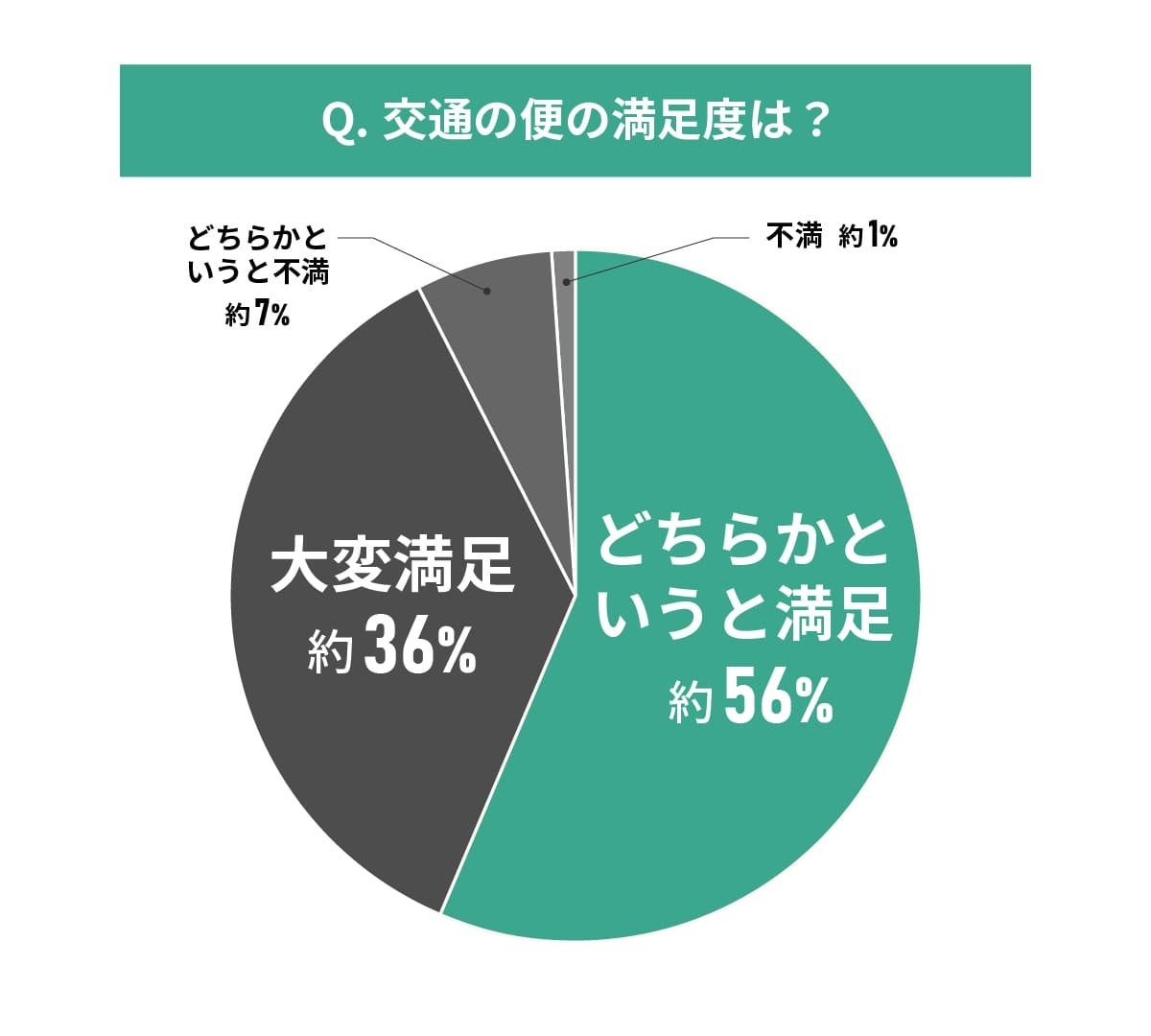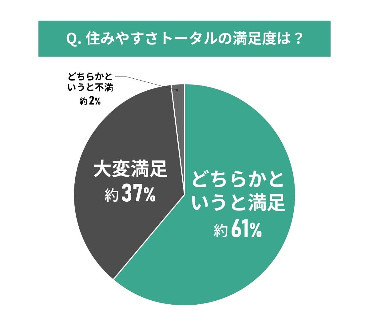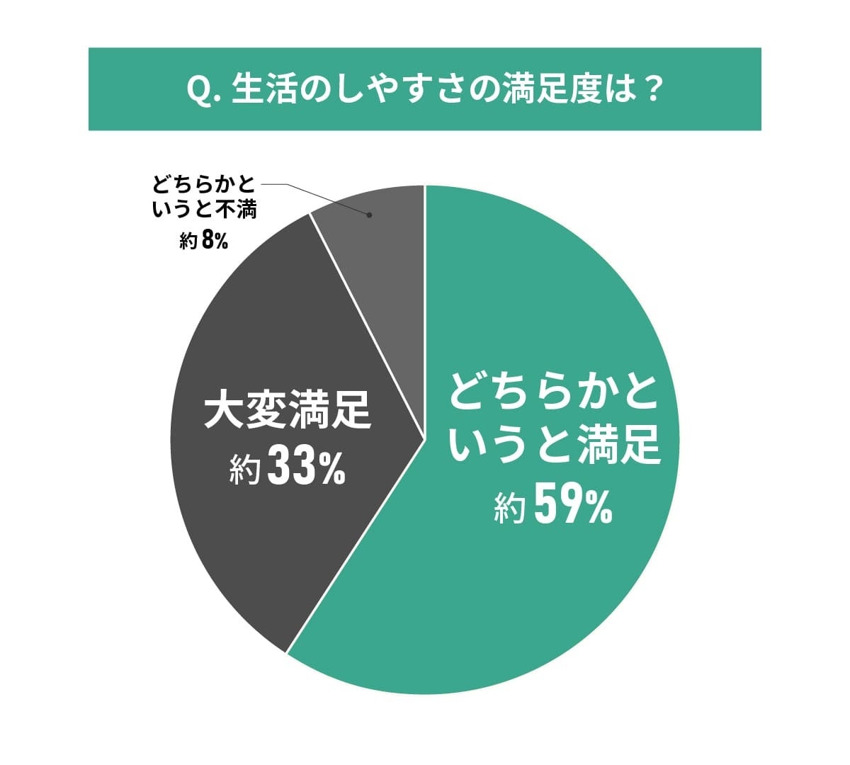 総合的な住みやすさについては、約98%が「大変満足している」「どちらかというと満足している」と回答し、非常に高い評価が得られました。「都会過ぎない雰囲気が住みやすい」「交通の便も良く、静かで住みやすい」「利便性、家賃、治安のバランスが良い」といった意見が多く見られました。