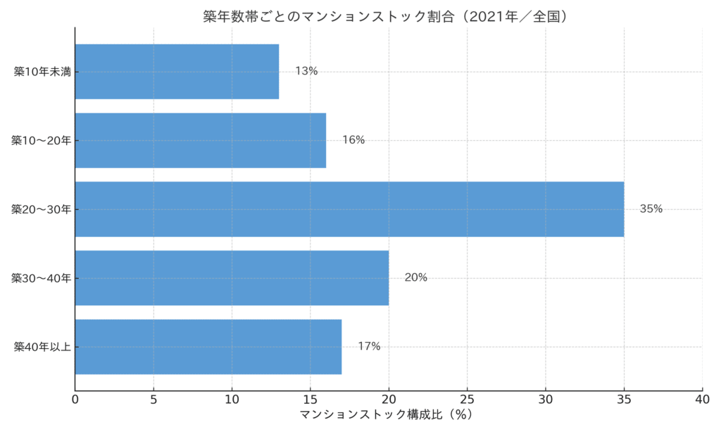 中古マンションは築年数によって“築浅”と“築古”に分けられますが、そもそもこれらの明確なラインはどこにあるのでしょうか。まずはじめにハッキリ言うと『築20年は築浅』に入ります。国土交通省のデータ(2021年末時点)によると、全国の分譲マンション686万戸のうち、もっとも多いのが「築20〜30年台」と、全体の約35%を占めています。