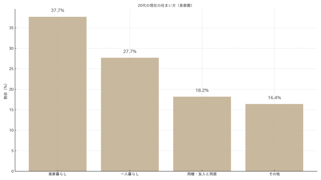 直近データによれば、首都圏在住20代の37.7%が実家暮らしで、一人暮らし(27.7%)を上回っており、全国でも同様の傾向にあります。また、同調査では、実家に住んでいる20代のうち55.7%が今後実家を出る予定・意思があるとしています。
