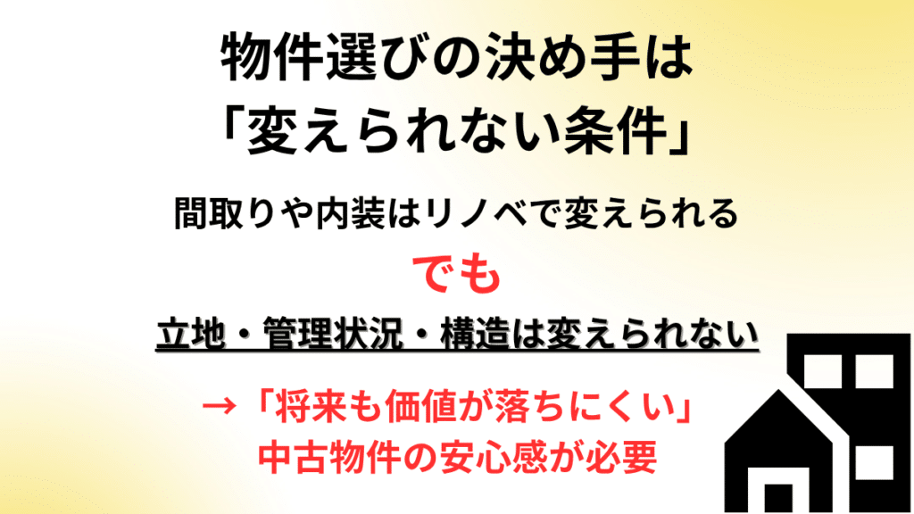 間取りや内装はリノベで変えられますが、立地・管理状況・構造は変えられません。