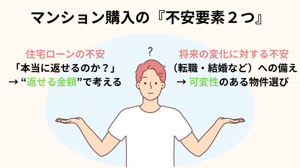 実際にマンション購入の検討をする際、特に20代独身では2つの不安が頭をよぎります。その不安と解決策を、以下にまとめました。