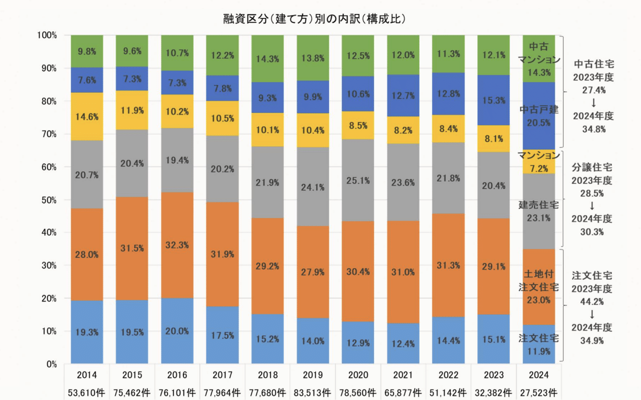 下図は、過去10年間のフラット35の利用割合を住宅の種類別に示したものです。