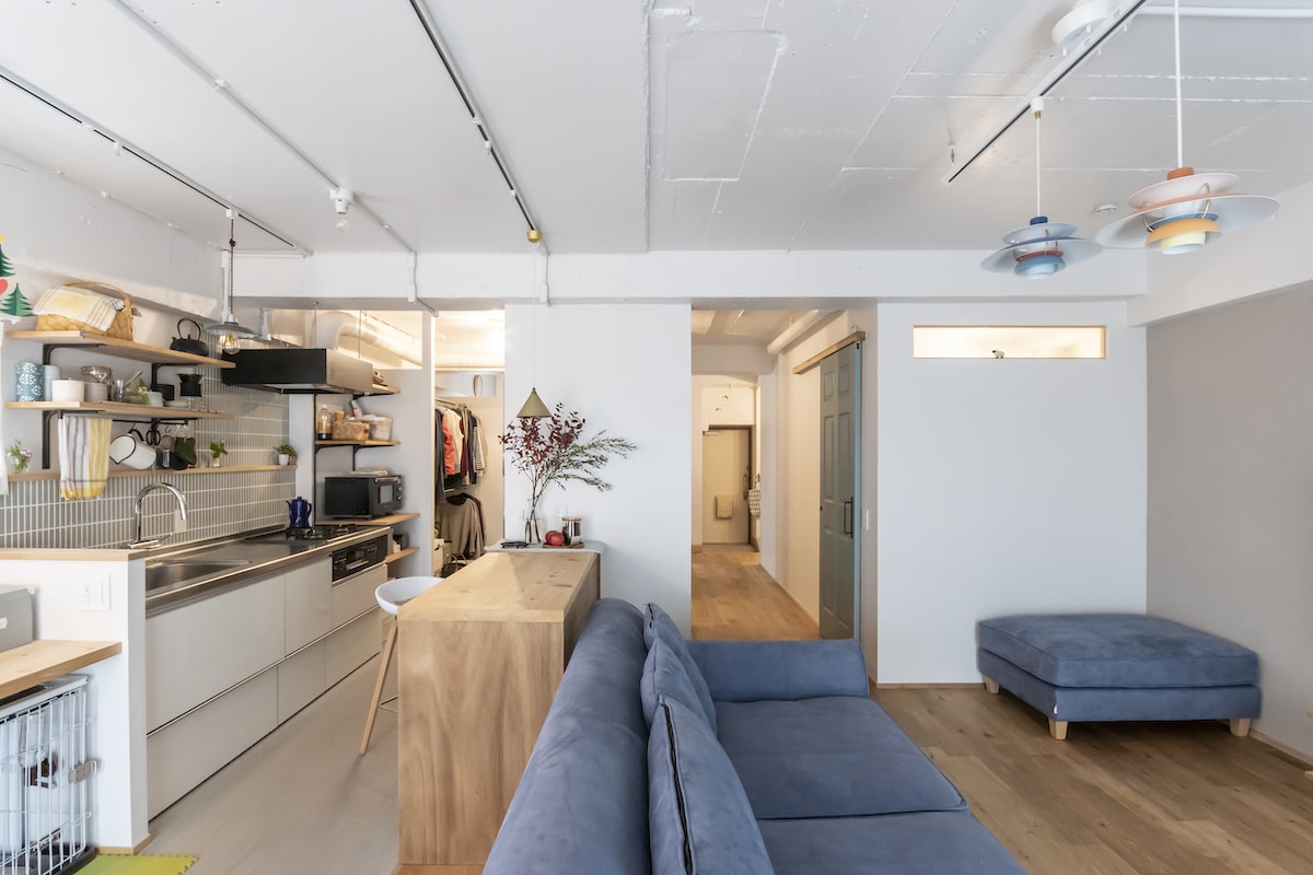 契約後、急いでリノベーションに着手。浴室やキッチンといった設備や一部の間仕切り変更など、ライフラインは専門家である工務店に依頼。それ以外はうださんが床や壁を剥がし、前職に大道具制作をしていた経験を活かして仕上げていった。最低限の生活空間をなんとか整え、入居可能になったのが出産10日前だったと、ゆかさんは笑って振り返る。