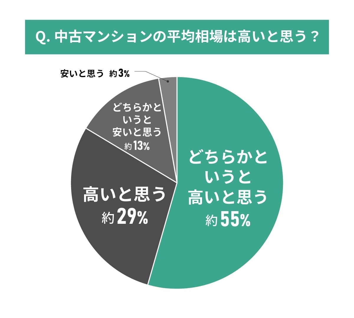 「どちらかというと高いと思う」と「高いと思う」を合わせると約84%に達します。中古マンションであっても、現在の価格水準に対して多くの人が高いと感じていることがわかります。